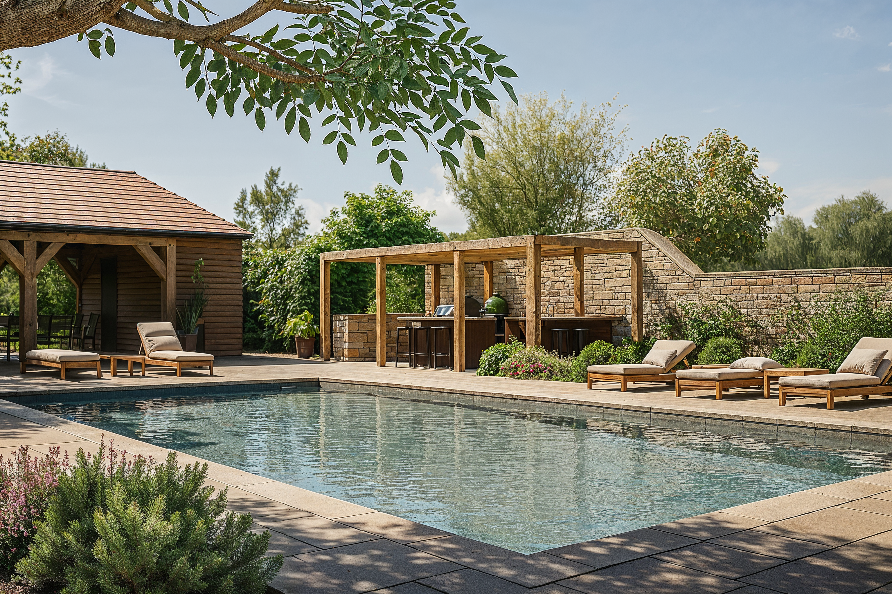 Our approach is to revitalise these spaces and introduce purposeful zones supporting family life and enhancing the estate’s natural flow. Formal garden areas will be restored and extended, with borders restructured to reinforce the original lawn layout. Beside the Coach House, a new outdoor living space with a covered oak-framed veranda, kitchen, and dining area will provide for entertaining. A swimming pool and recreational lawn will extend the rural setting. The historic Apple Store will be refurbished as a gym, surrounded by native planting and a regraded garden approach. New walking paths through the poplar wood and paddocks will create direct connections with the wider landscape. Materials are being chosen to complement the architecture—soft limestone paving, gravel paths, and reclaimed timber details will give the garden a refined, understated quality.