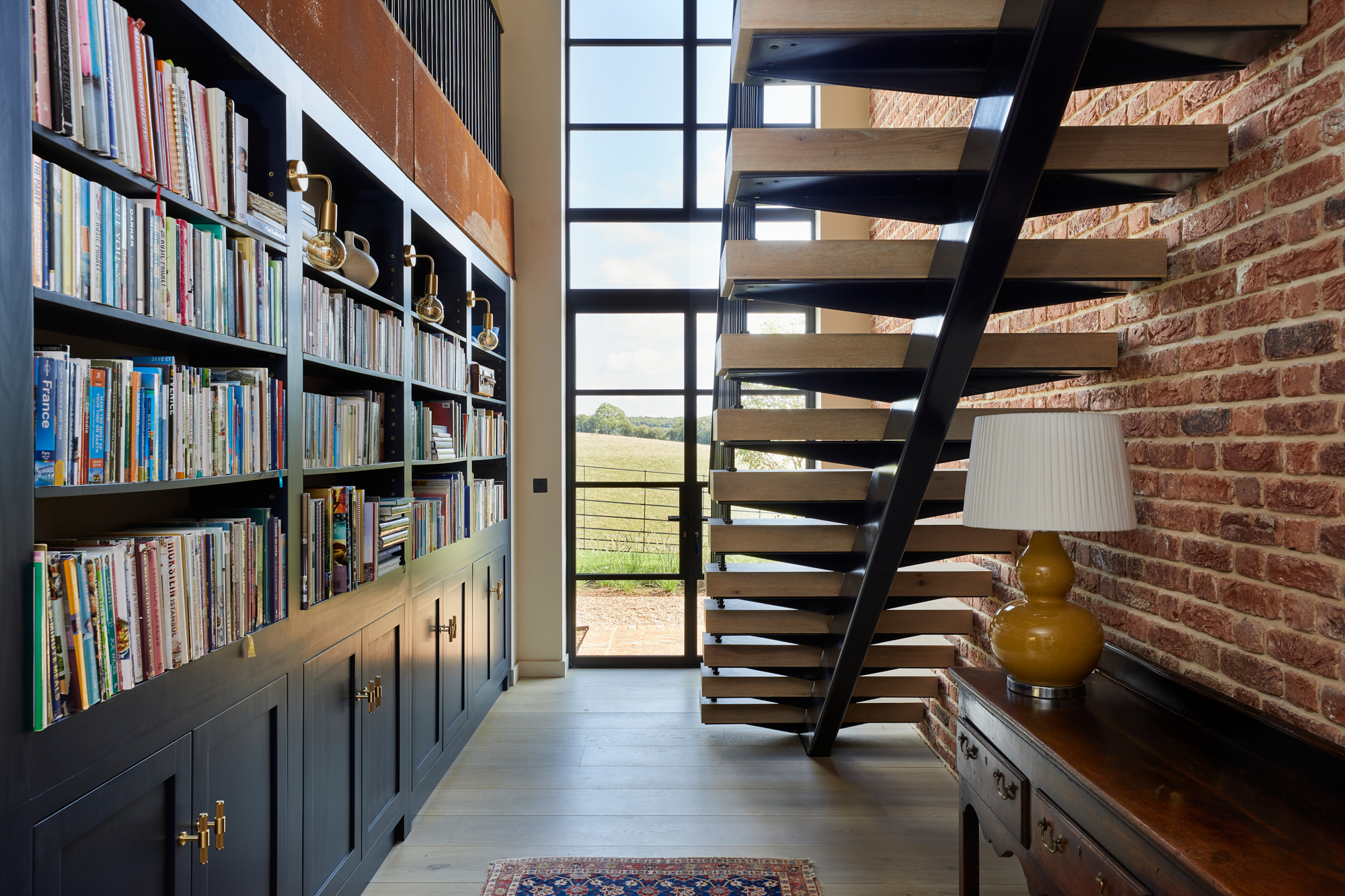 We proposed a replacement build that would frame the views and create a strong connection with the outdoors. Floor-to-ceiling glazing fulfills this brief throughout each of the main living spaces, while contemporary industrial-style elements add layers of character, including Crittal glazing, exposed Chiltern red brick walls, a Glulam roof structure and glowing Corten steel accents.