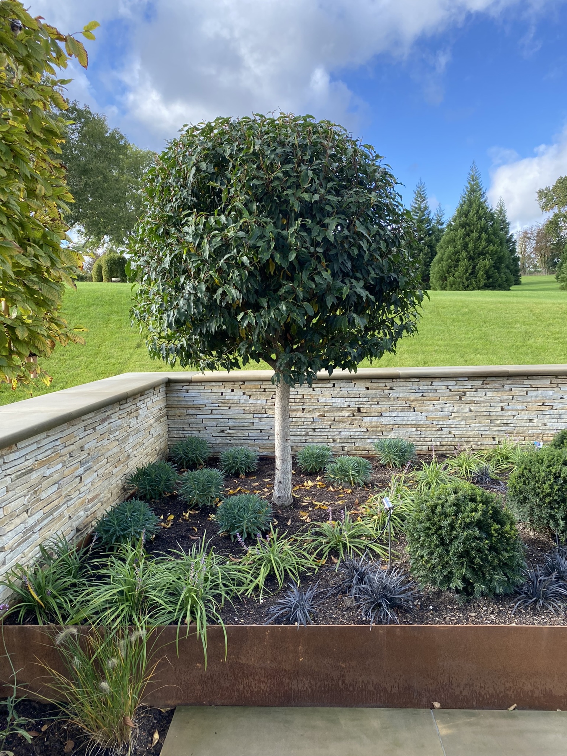When seasonal planting recedes, shape and framework define the space. Clipped evergreens such as yew (Taxus baccata) and holly (Ilex aquifolium) give structure and rhythm, while ornamental grasses like Miscanthus sinensis and perennials such as Phlomis russeliana retain their seed heads, adding height, movement and subtle light-catching detail.
