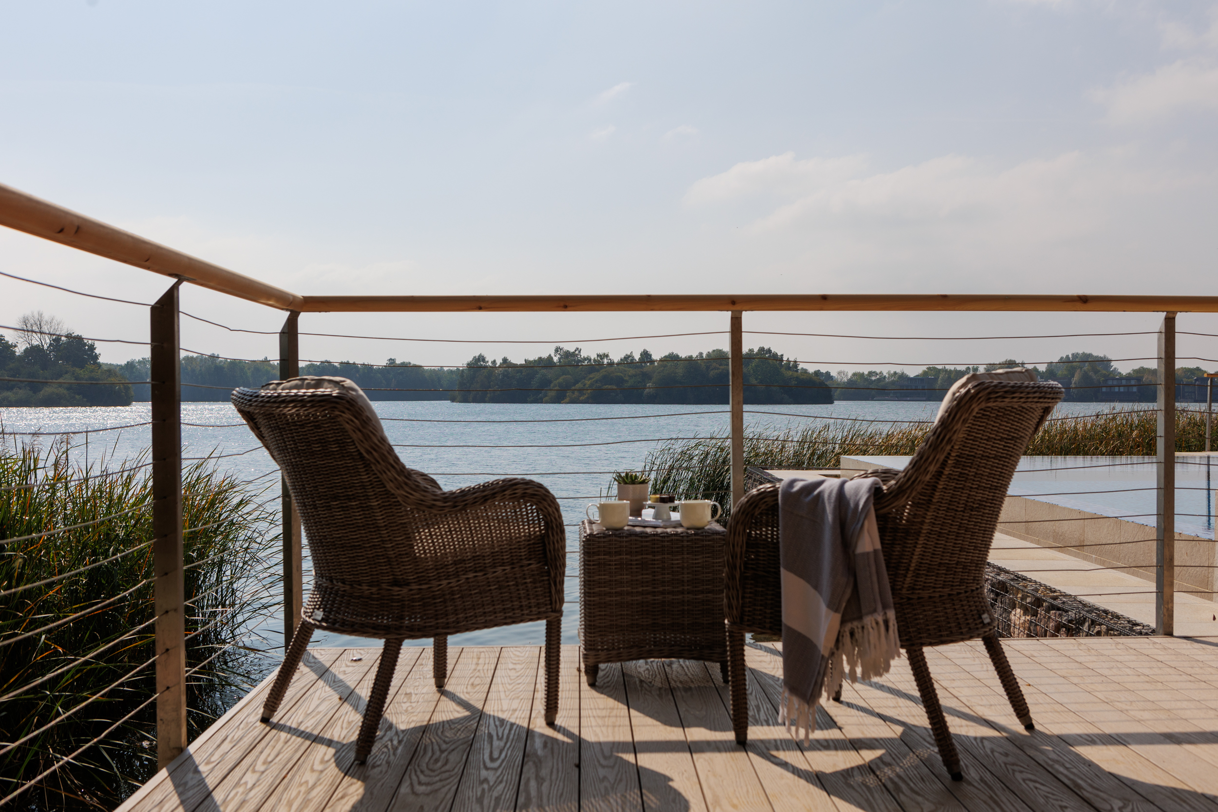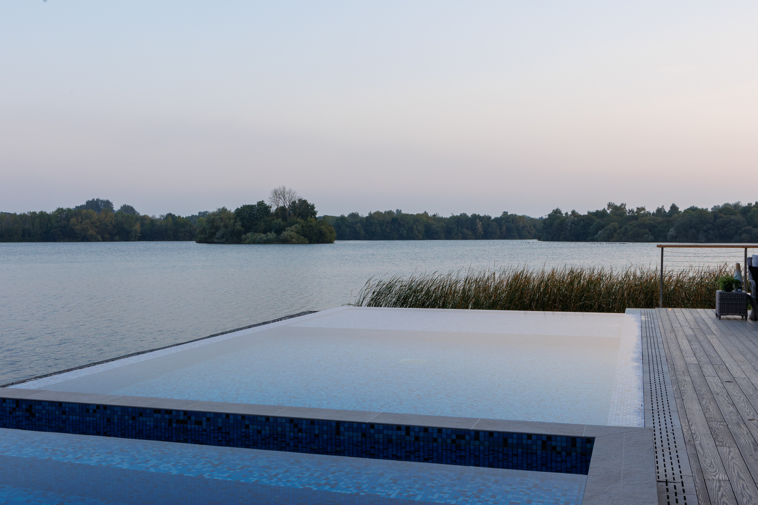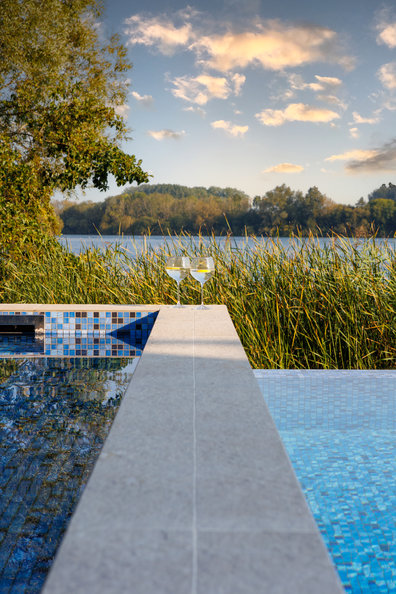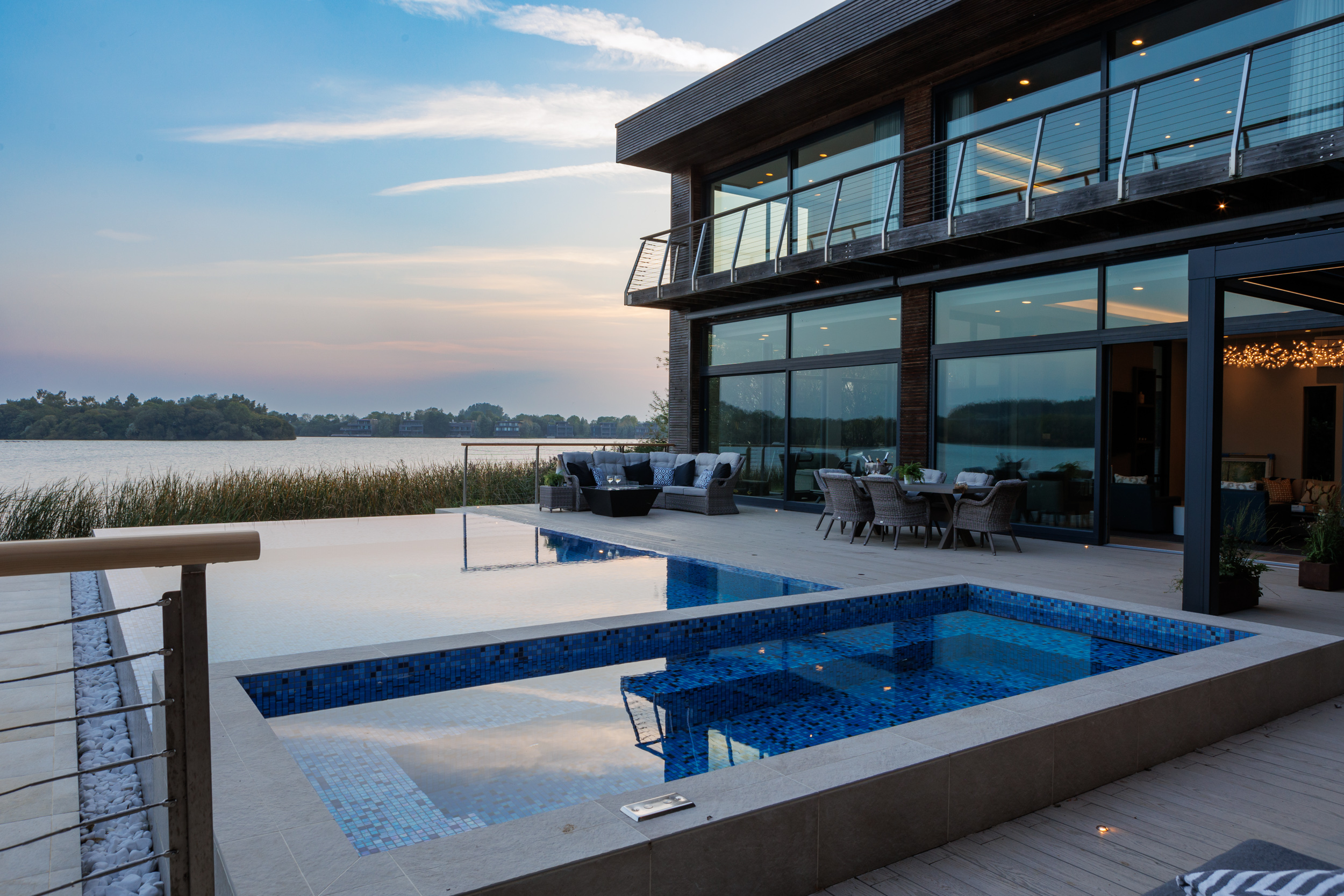 The contemporary garden design of a Cotswold lakeside property, featuring the installation of an infinity-edge pool, spa, and outdoor shower. A generous sized deck wrapped around the pool creates a California-inspired atmosphere, blending indoor and outdoor living. Multifunctional seating spaces for entertaining include a covered dining area, cosy fire pit and sun loungers by the pool for lazy summer-days relaxing.
