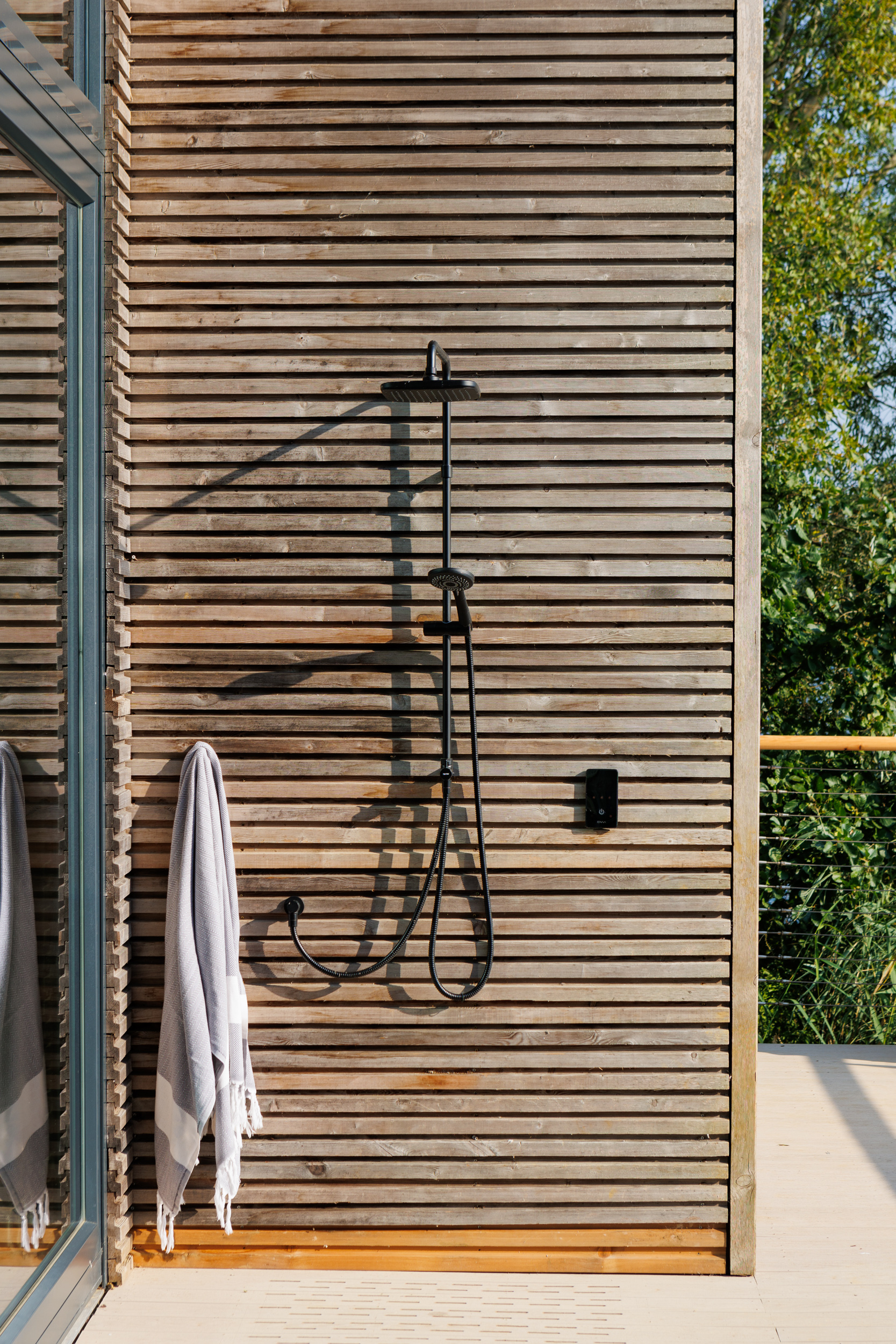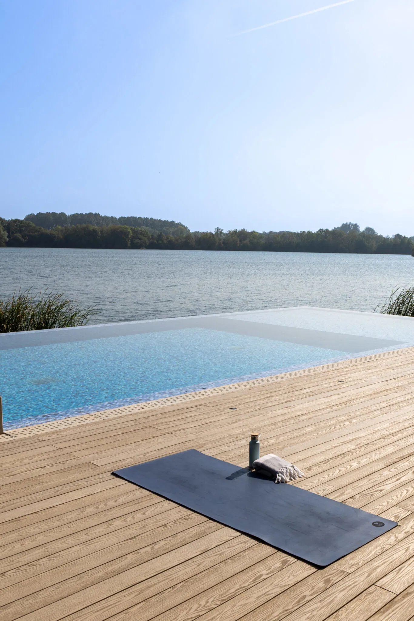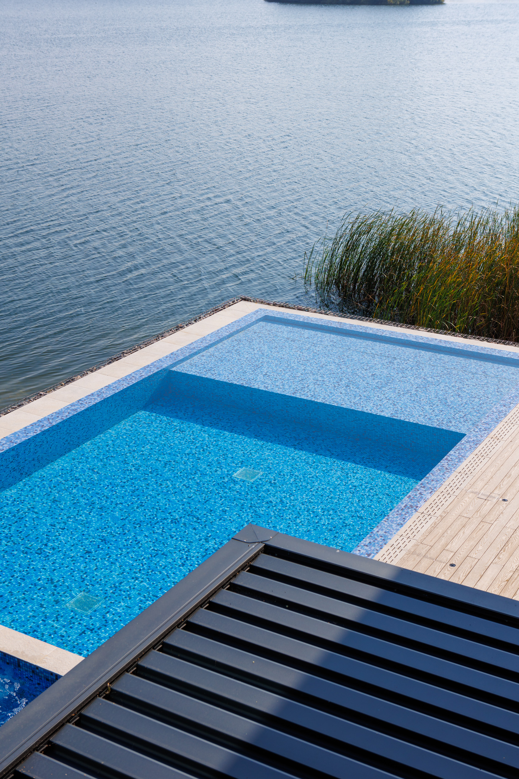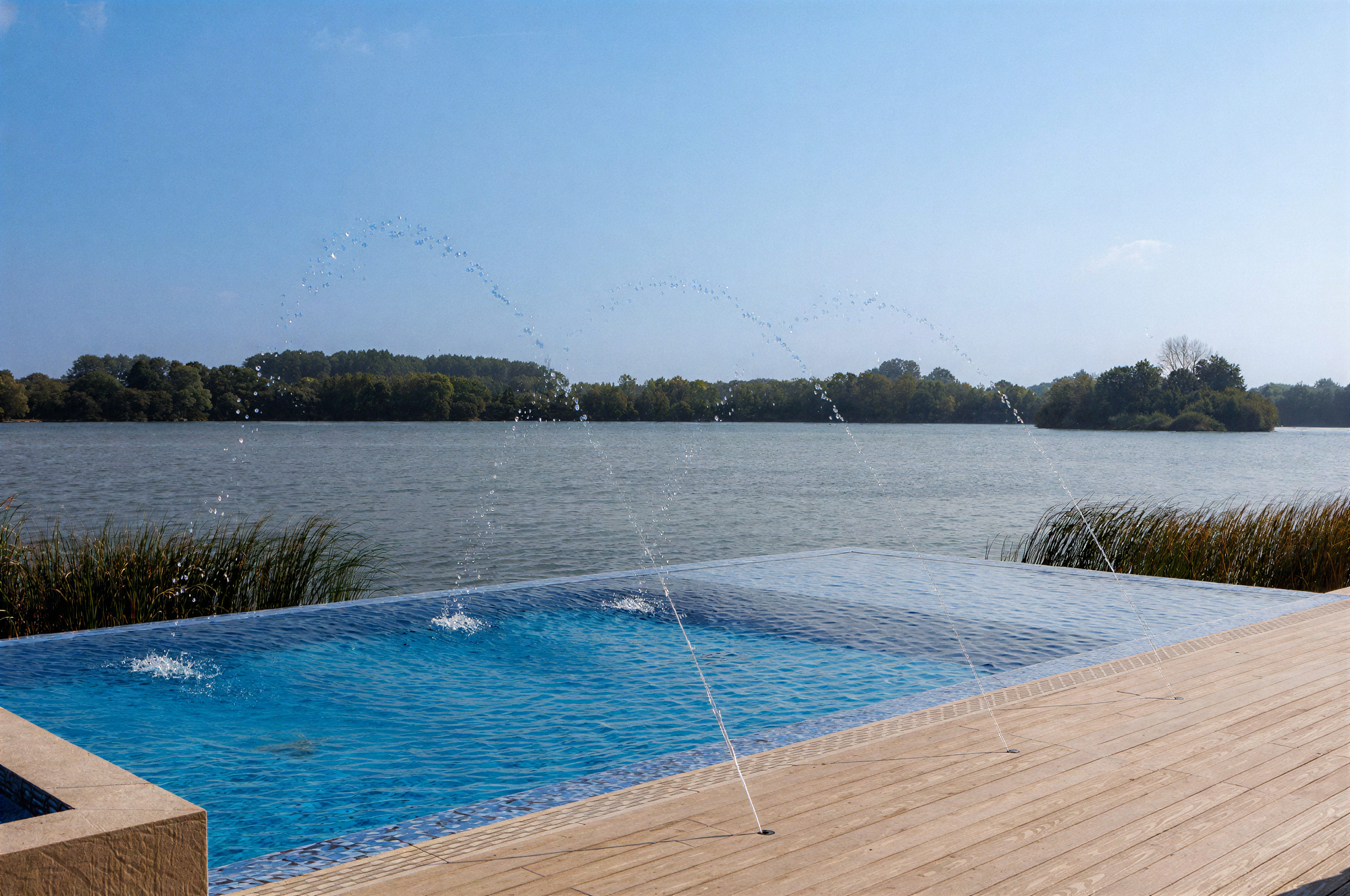 The contemporary garden design of a Cotswold lakeside property, featuring the installation of an infinity-edge pool, spa, and outdoor shower. A generous sized deck wrapped around the pool creates a California-inspired atmosphere, blending indoor and outdoor living. Multifunctional seating spaces for entertaining include a covered dining area, cosy fire pit and sun loungers by the pool for lazy summer-days relaxing.