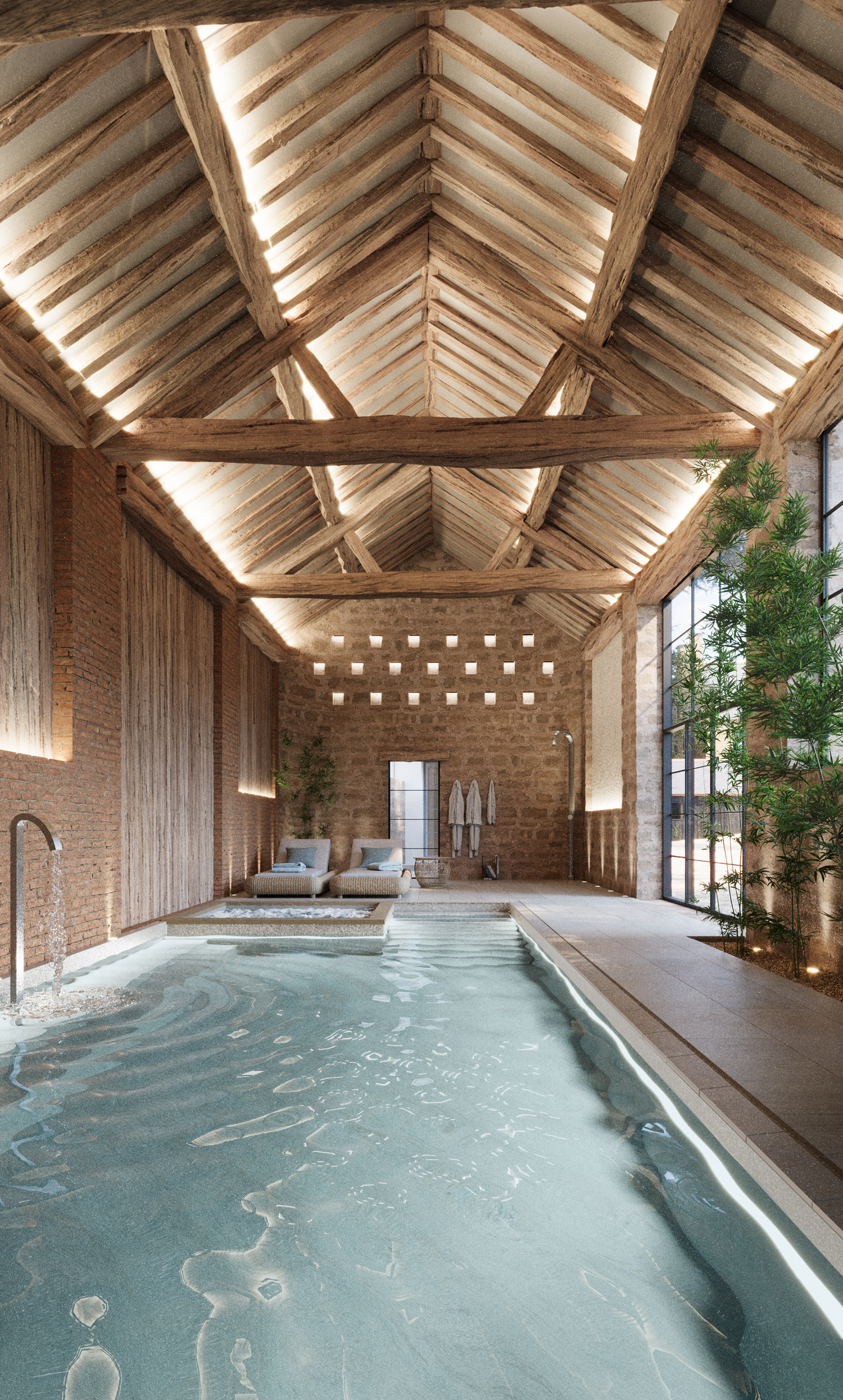 Set within a conservation area in the Cotswolds, these wellness barns form part of a large Grade II* listed estate. A series of disused outbuildings and barns are being converted into contemporary spa and entertainment spaces.