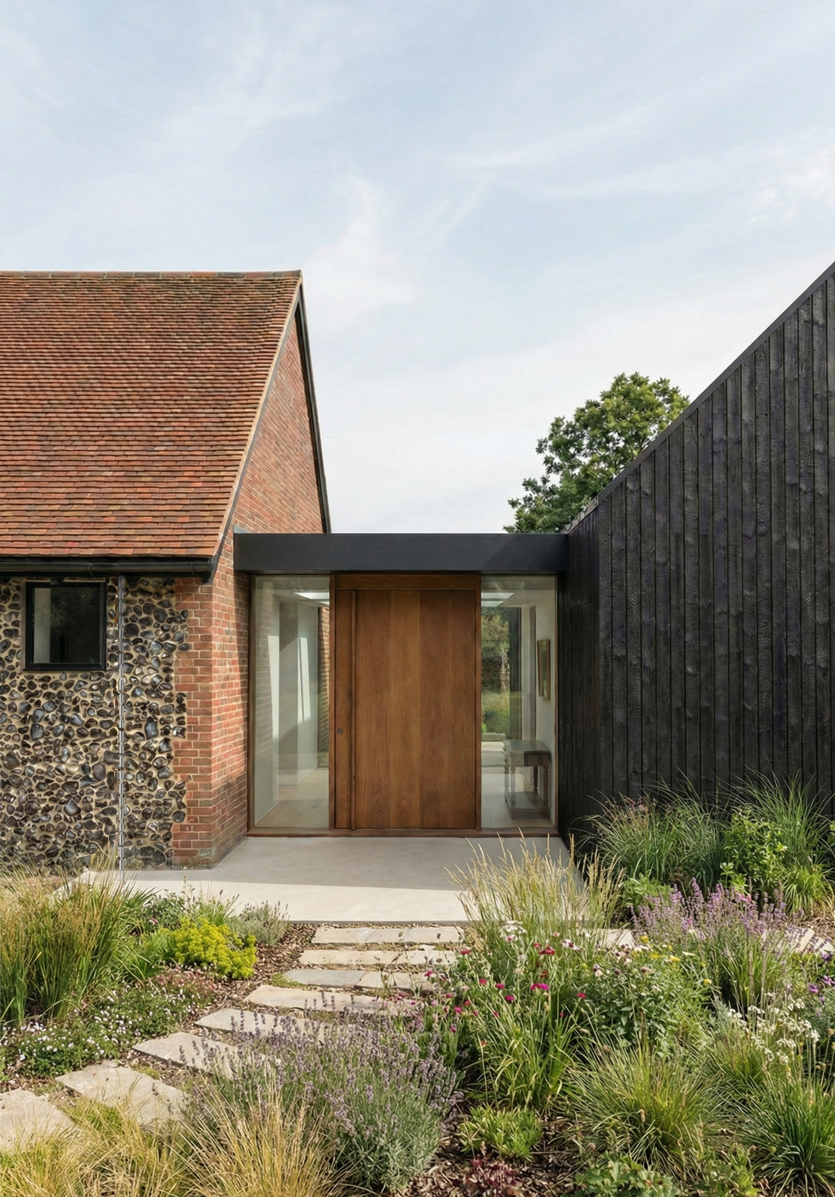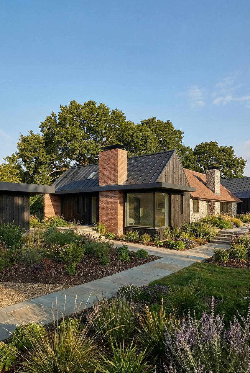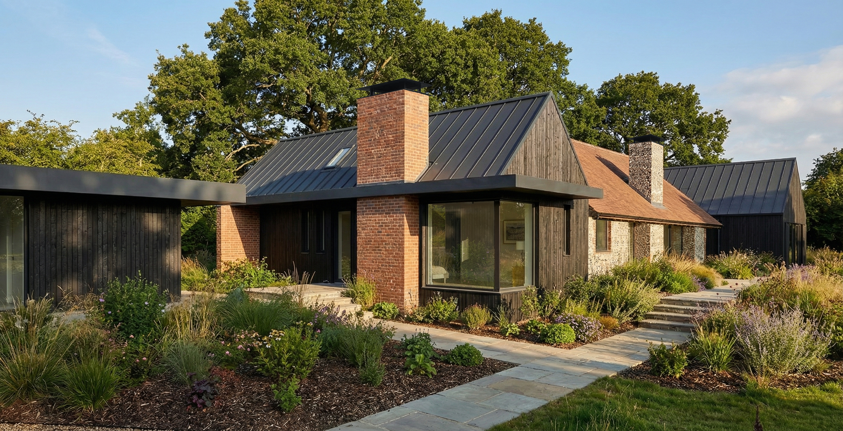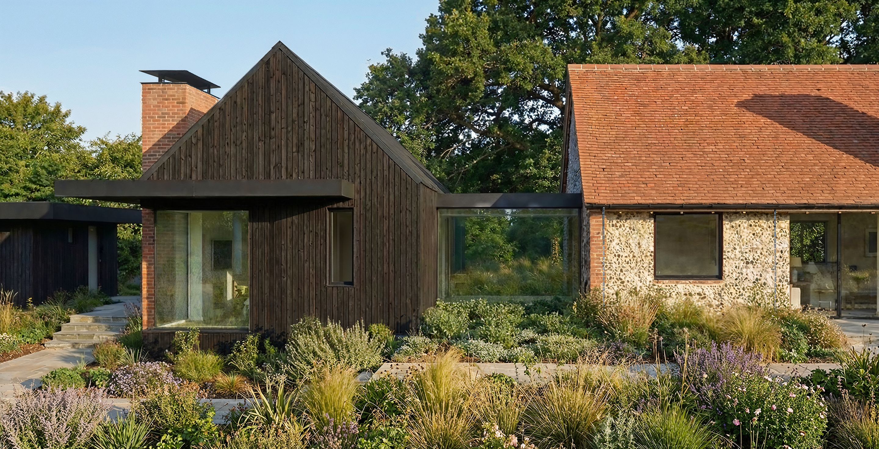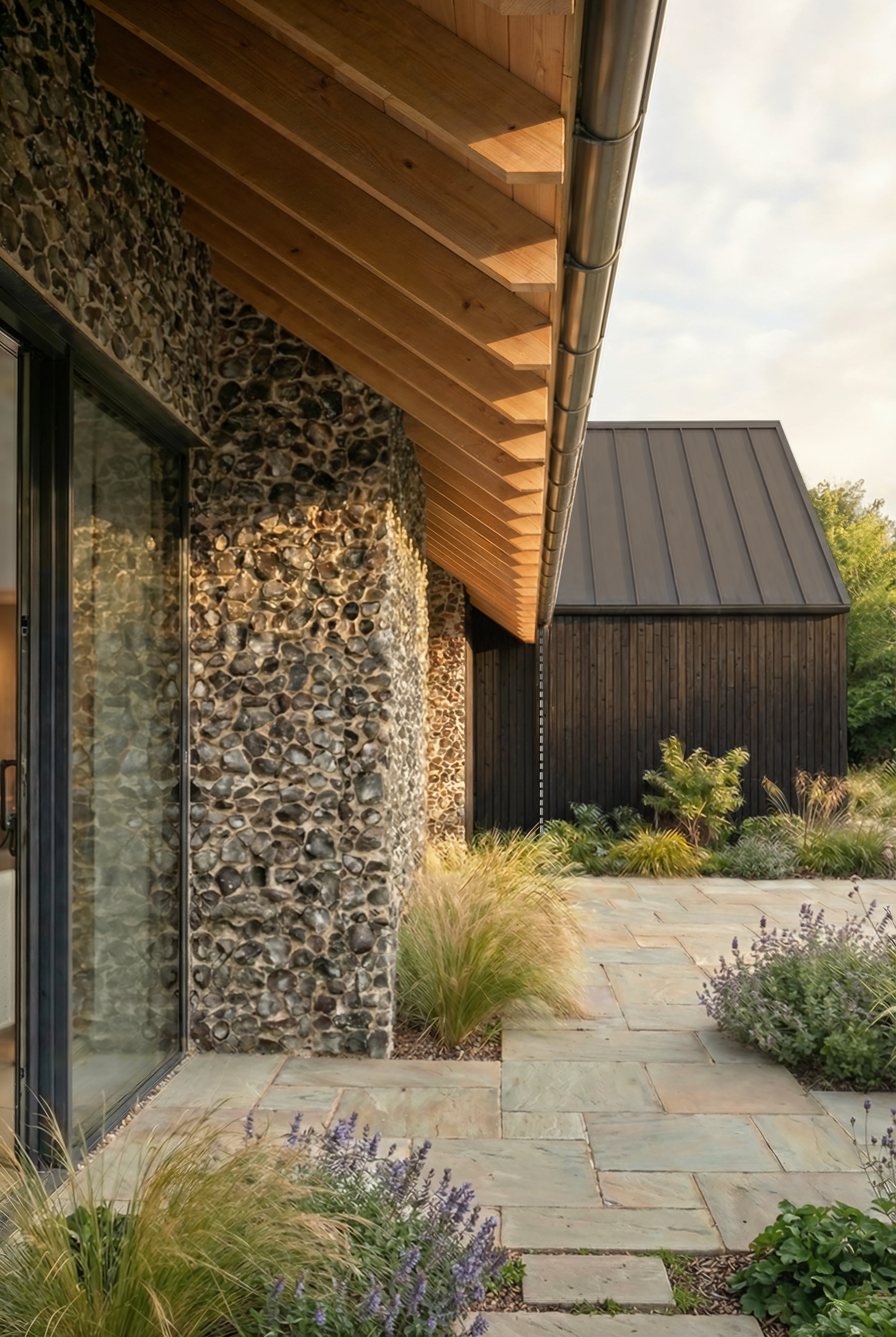 Oakfield is a contemporary home shaped by the materials and forms of the Chilterns, designed to sit comfortably within its rural setting. The plan centres on a vaulted kitchen, living and dining space oriented south towards open countryside. A crafted timber roof structure defines this primary volume, expressed internally and visible externally, giving the house a clear architectural focus and strong sense of identity.