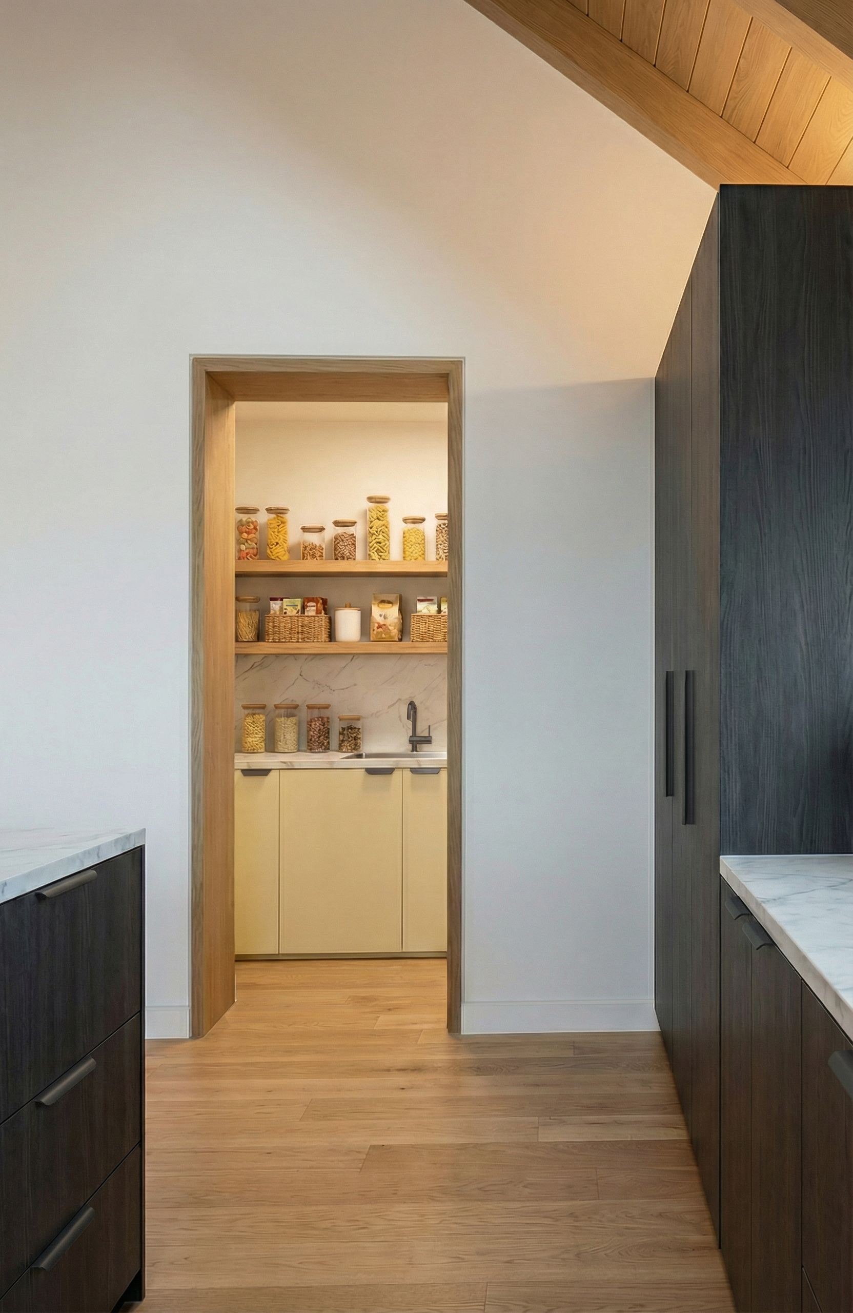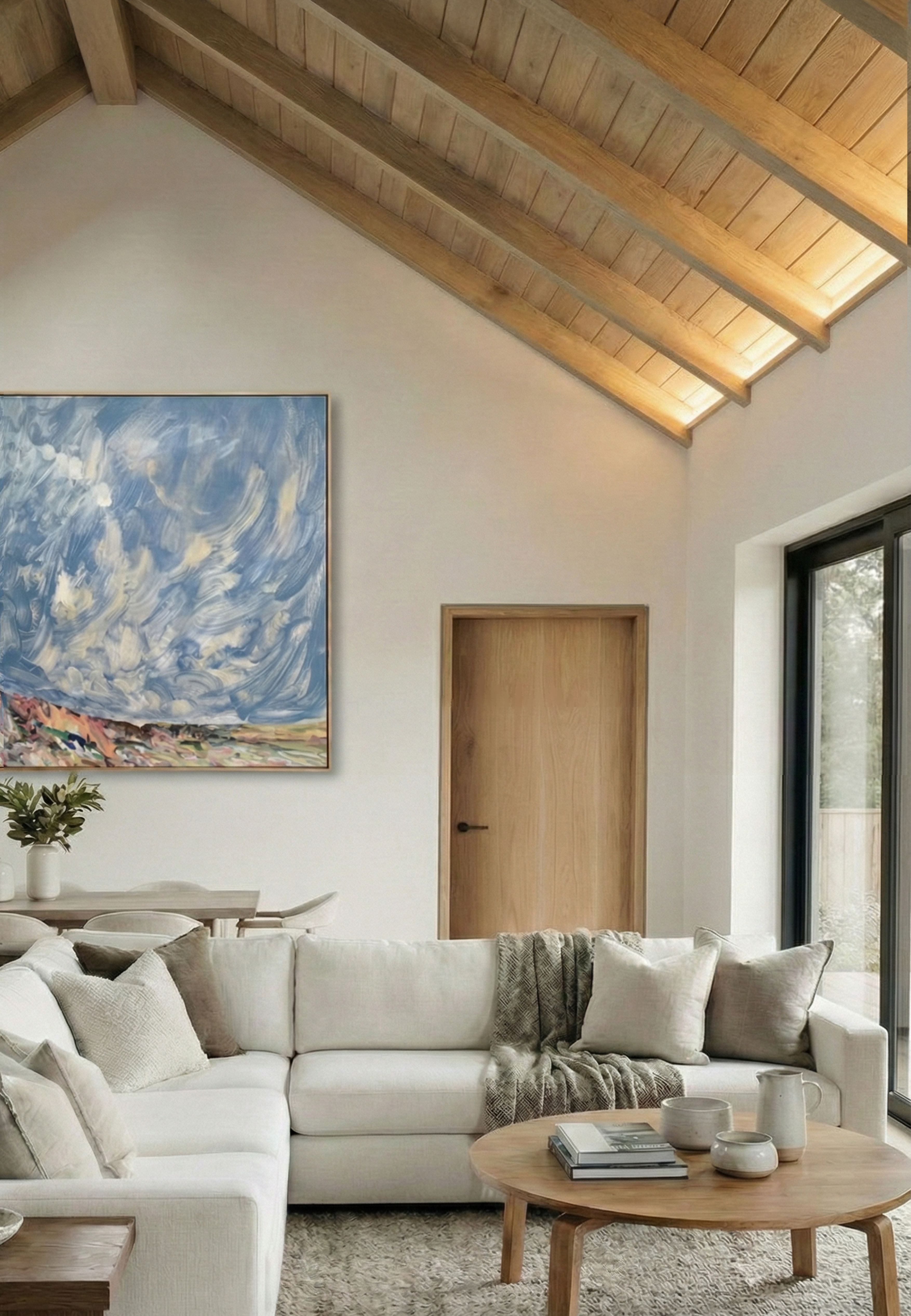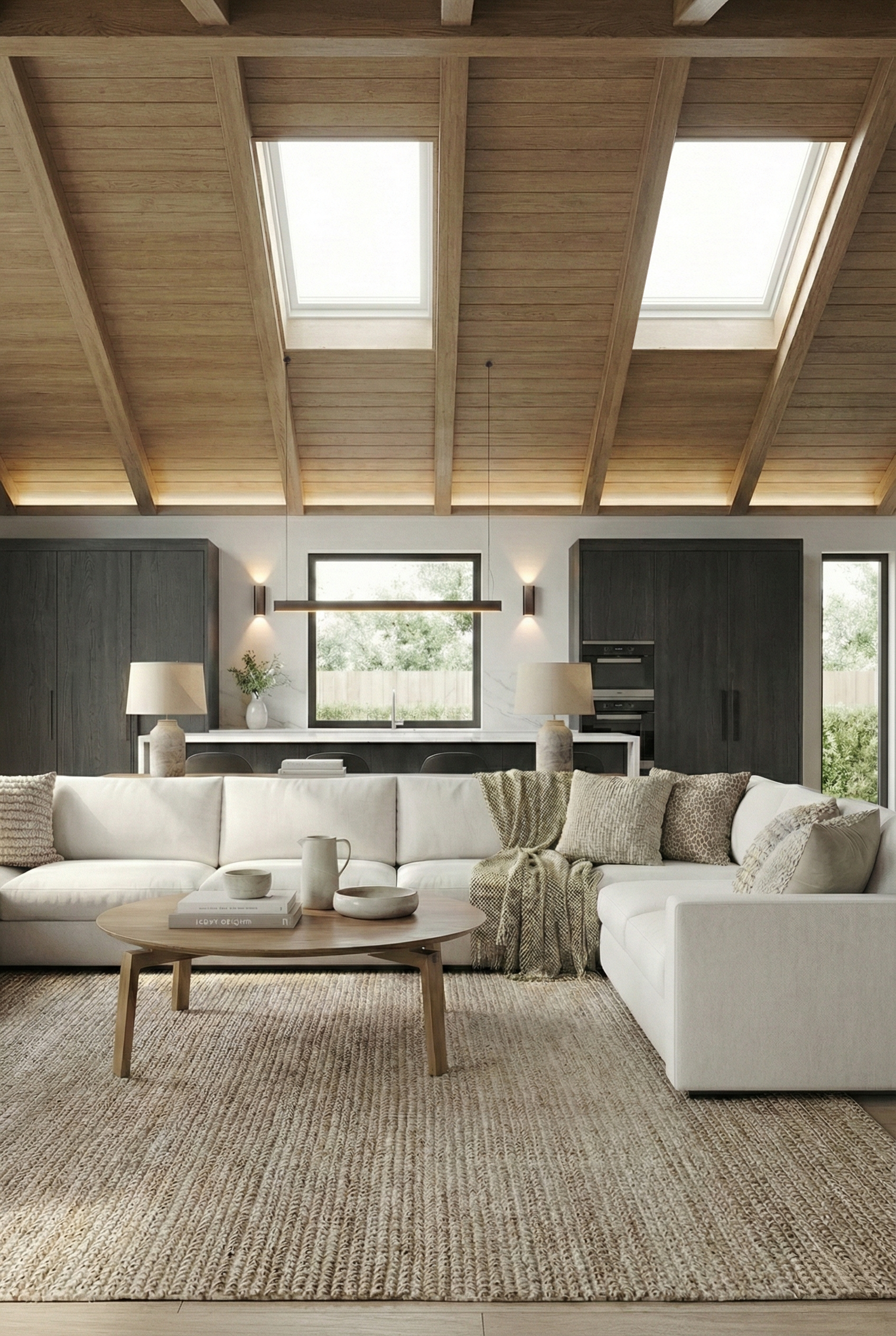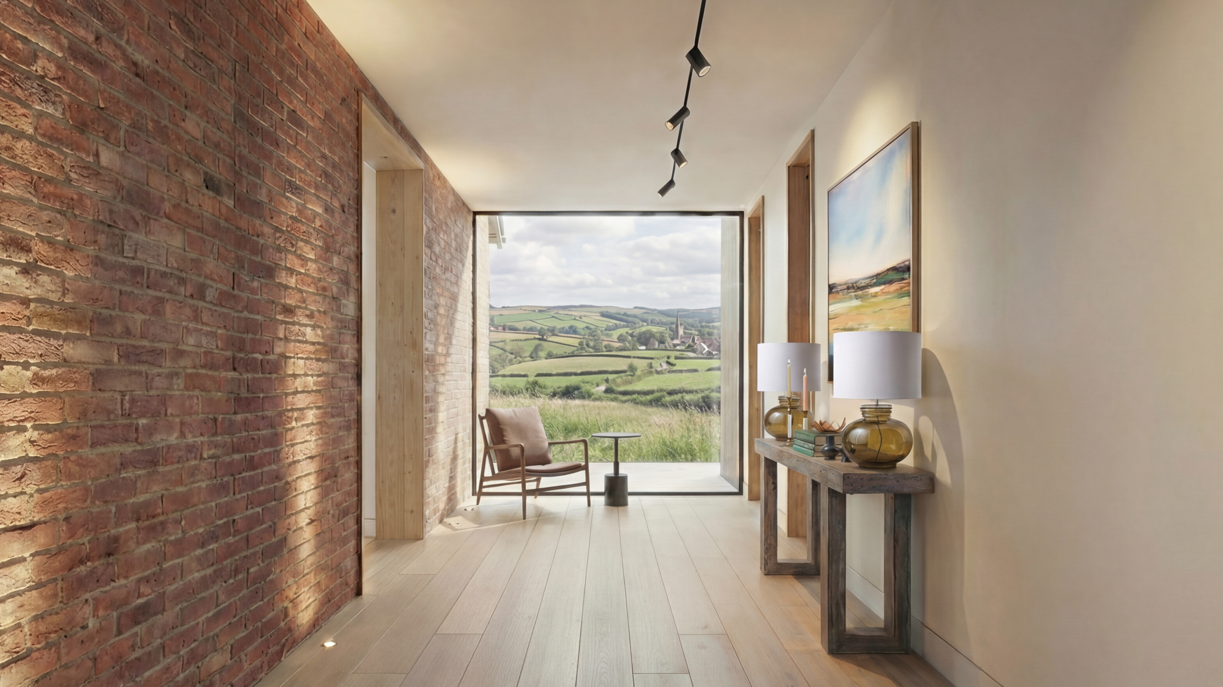 Oakfield is a contemporary home shaped by the materials and forms of the Chilterns, designed to sit comfortably within its rural setting. The plan centres on a vaulted kitchen, living and dining space oriented south towards open countryside. A crafted timber roof structure defines this primary volume, expressed internally and visible externally, giving the house a clear architectural focus and strong sense of identity.
