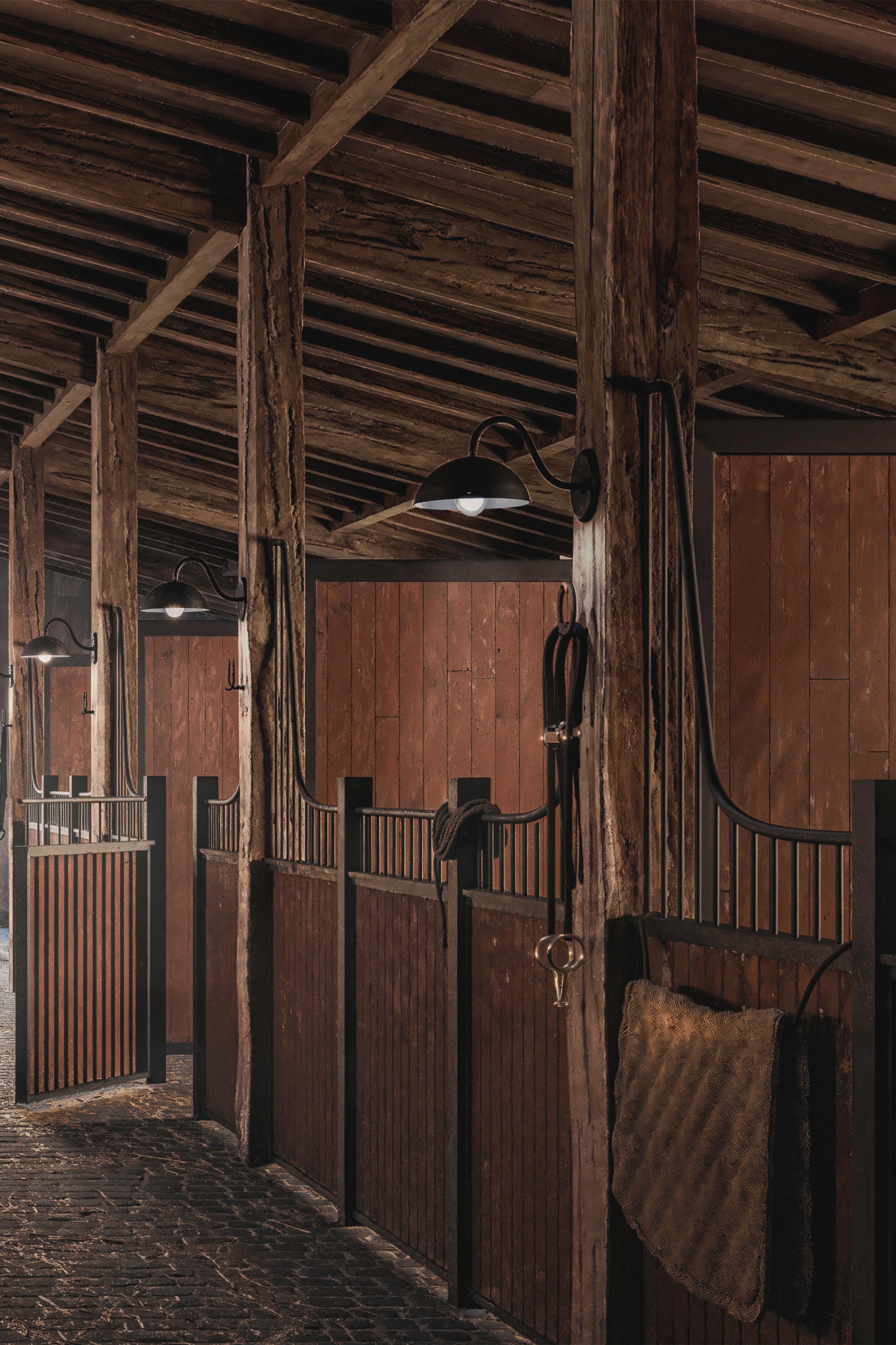 The new stable building is contemporary yet respectful in its hierarchy and materiality, using a stone plinth, timber cladding, and metal roof to respond to the rural setting. Stables are arranged around a central courtyard inspired by Georgian architecture, featuring arched entrances and a simple ornamental clock tower, while maximising daylight and ventilation.