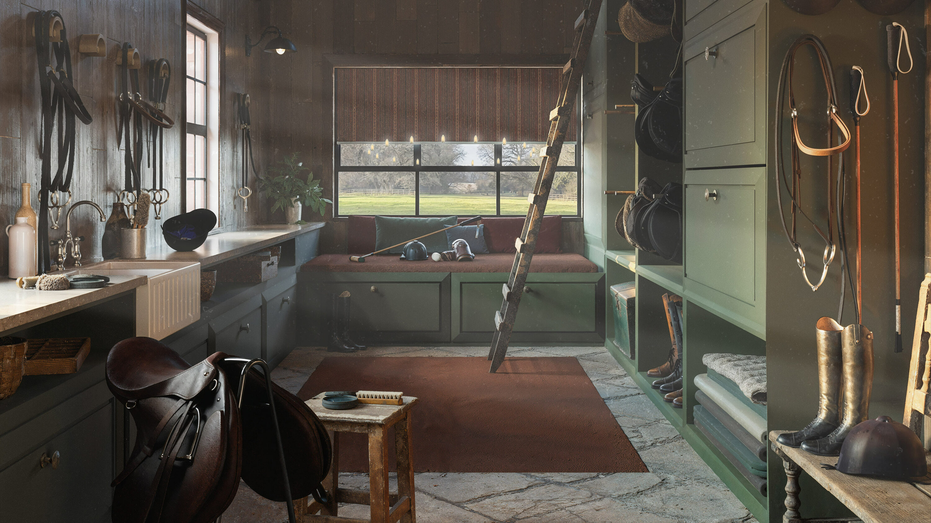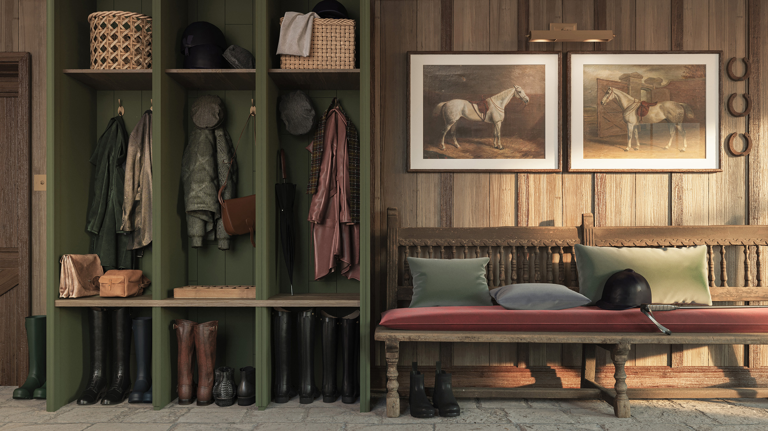 We will incorporate traditional touches such as wrought iron fixtures, leather accents, and vintage equestrian artwork, while adding practicality with built-in cabinetry, saddle racks, and ample seating areas for a refined yet functional space.