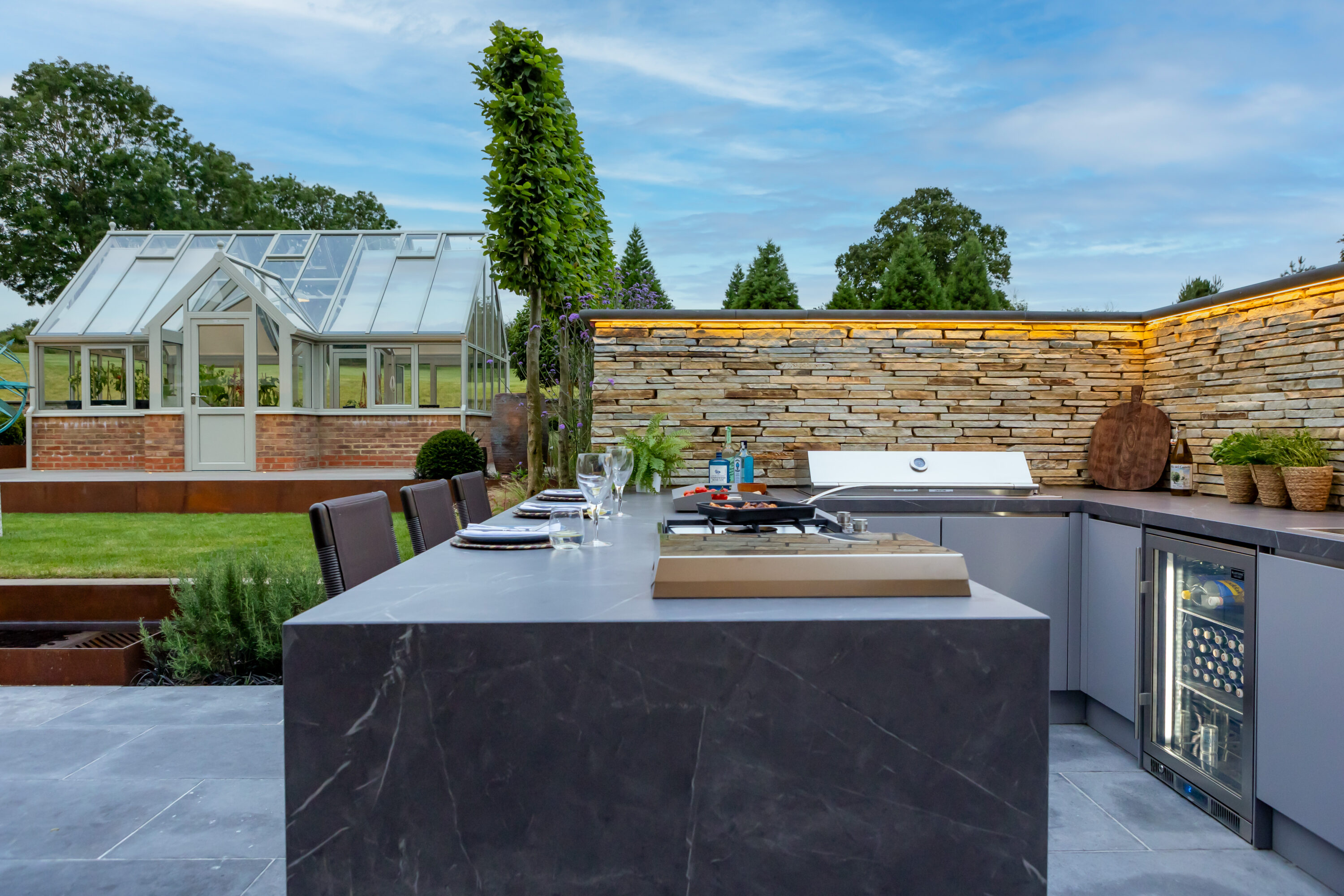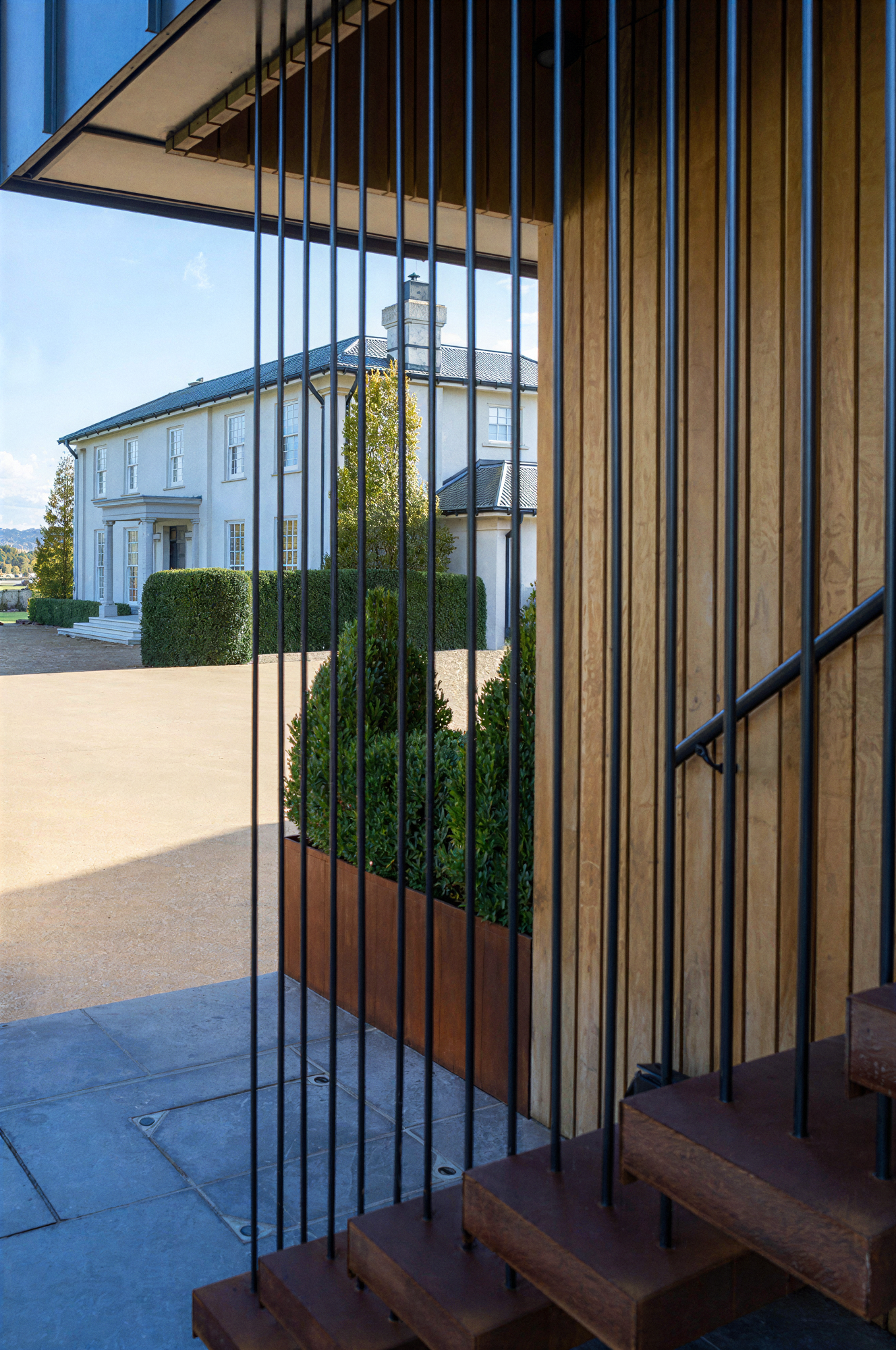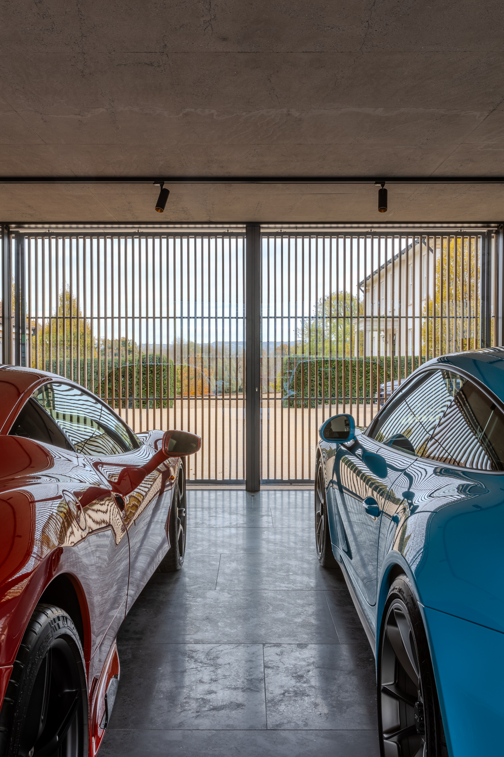 Full-height glazing to both sides of the car gallery establishes a strong visual and physical connection to the rest of the property. Above, a self-contained guest apartment and office studio are accessed via a sculptural external staircase.