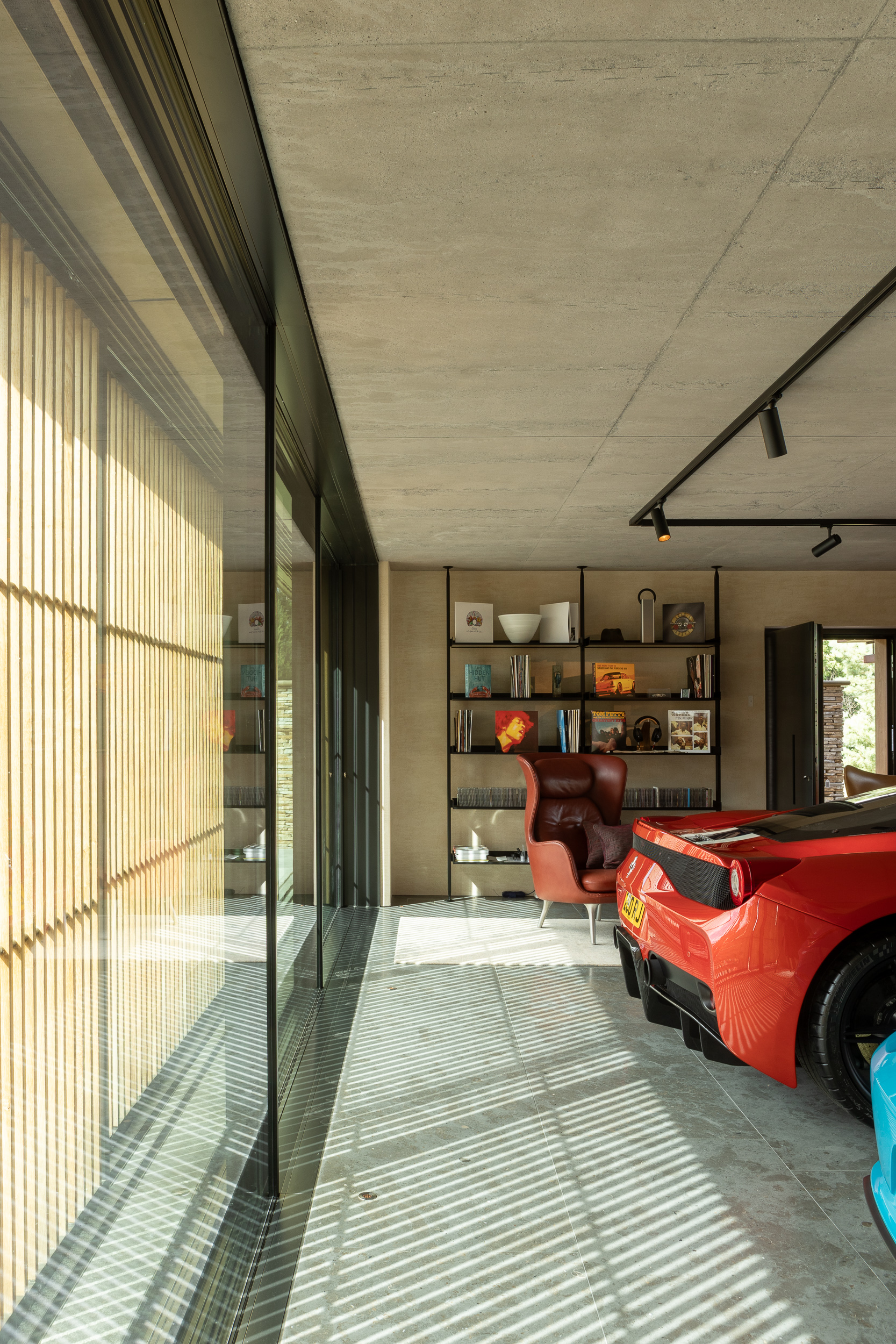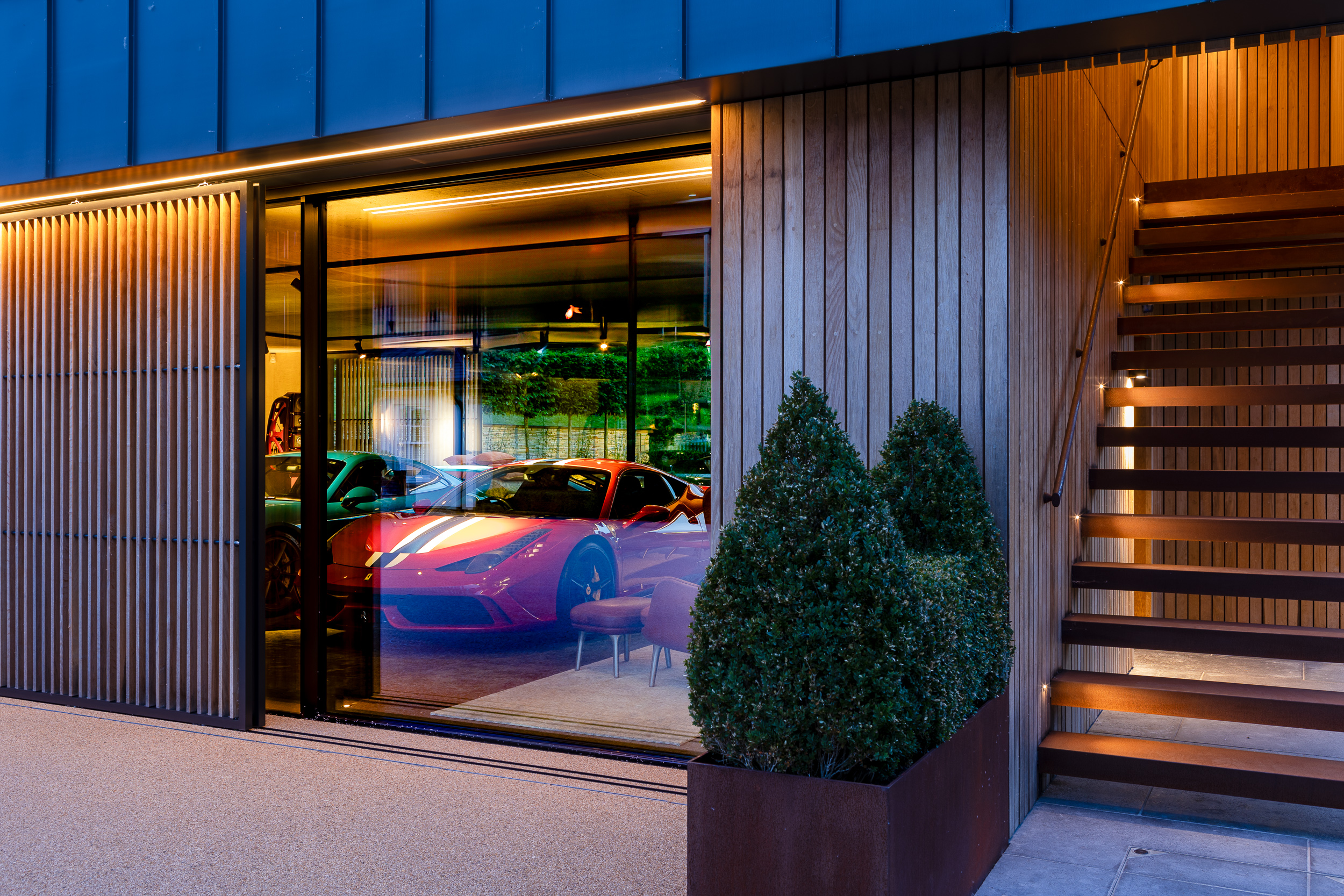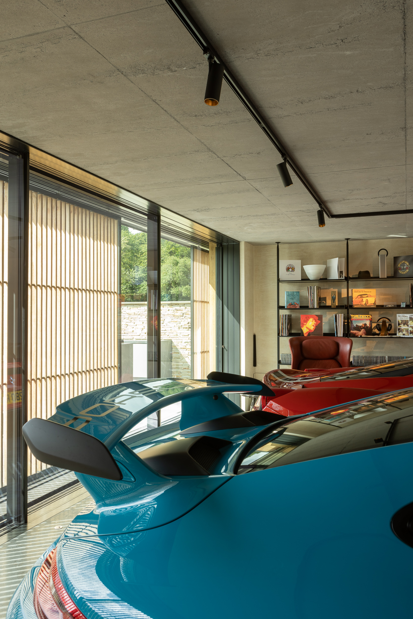 Set within a large Oxfordshire estate, this three-bay glazed car gallery was conceived as both a functional garage and a display space.